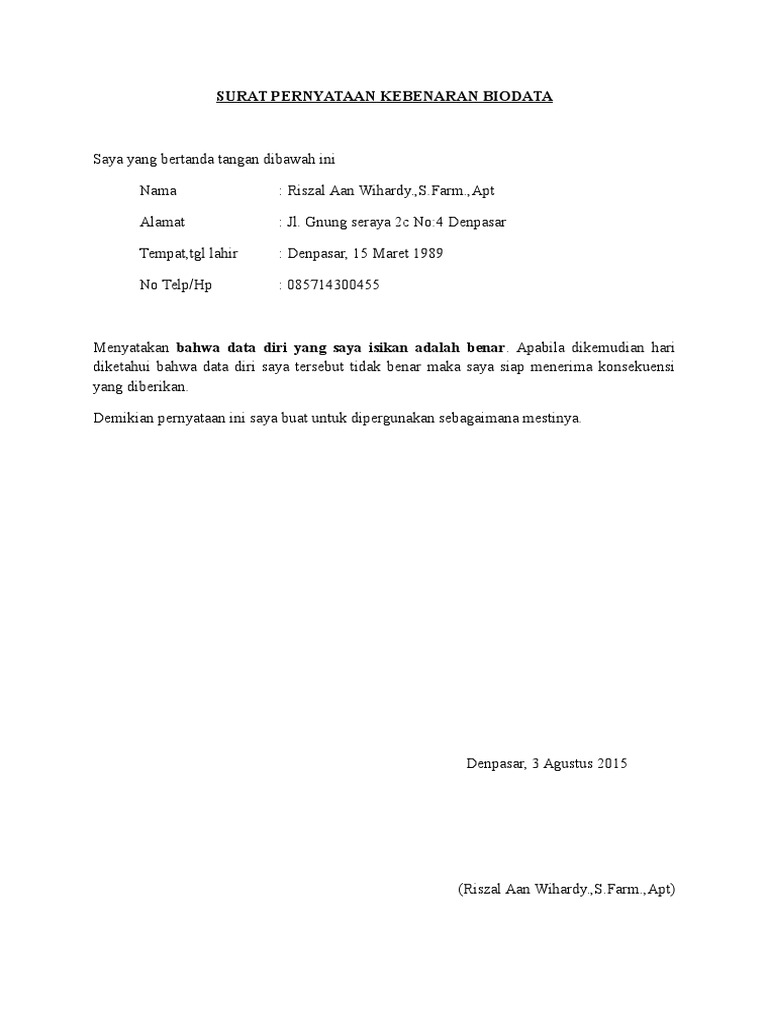 Saya yang bertanda tangan di bawah ini Sebab berbeda keperluan dan juga berbeda surat pernyataan, bahkan pemberi pernyataan juga akan berbeda. Demikian pengajuan surat pernyataan pengunduran diri ini dibuat dengan sebenarnya tanpa campur tangan pihak lain. Sebagai contoh, surat pernyataan diri yang menerangkan bahwa kondisi diri yang. Surat pernyataan diri biasanya digunakan oleh seseorang untuk meyakinkan pihak lain yang meminta untuk diyakinkan. Sahabat 99, secara sederhananya surat seperti ini adalah sebuah adapun jenis surat seperti ini di antaranya surat pernyataan diri, hutang, kesanggupan, kerja, kepemilikan. Contoh surat pernyataan diri dan tips membuatnya dengan baik, surat pernyataan diri kesehatan, menikah, menjual barang, surat peryataan diri hukum, kriminal dan masih banyak lagi akan admin bahas kali ini. Surat pernyataan juga memilki fungsi mengikat seseorang agar seseorang tidak dapat bertindak sesuka sendiri dan jera dalam melakukan hal buruk. Ada banyak sekali ragam contoh surat pernyataan yang bisa anda jadikan referensi di sini. Semoga dengan contoh surat pernyataan di atas, anda bisa mendapat gambaran lebih gamblang dan dapat membuat surat pernyataan yang benar dan sesuai. Surat pernyataan adalah surat penjelasan yang menyatakan diri dengan lengkap untuk suatu kondisi yang sebenarnya ✓ yuk simak contohnya. Dengan surat ini, kita dapat mengikat seseorang untuk keperluan sesuai dengan kasus atau pernyataan yang ingin di lakukan. Misalnya, jaminan tentang tak adanya ikatan dengan perusahaan lain serta bersih dari perbuatan.